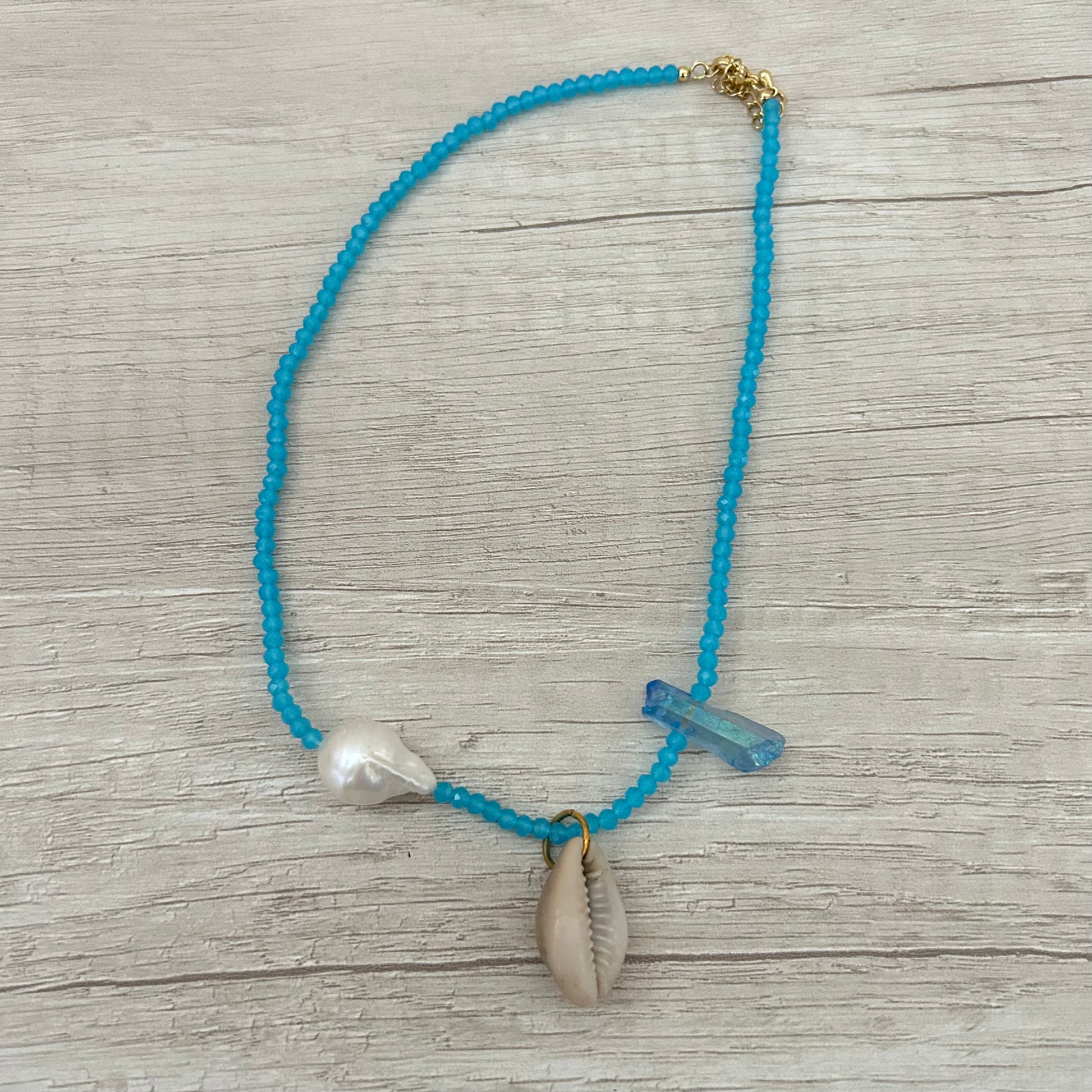 Collar cristales celestes con un perlón irregular de agua dulce.