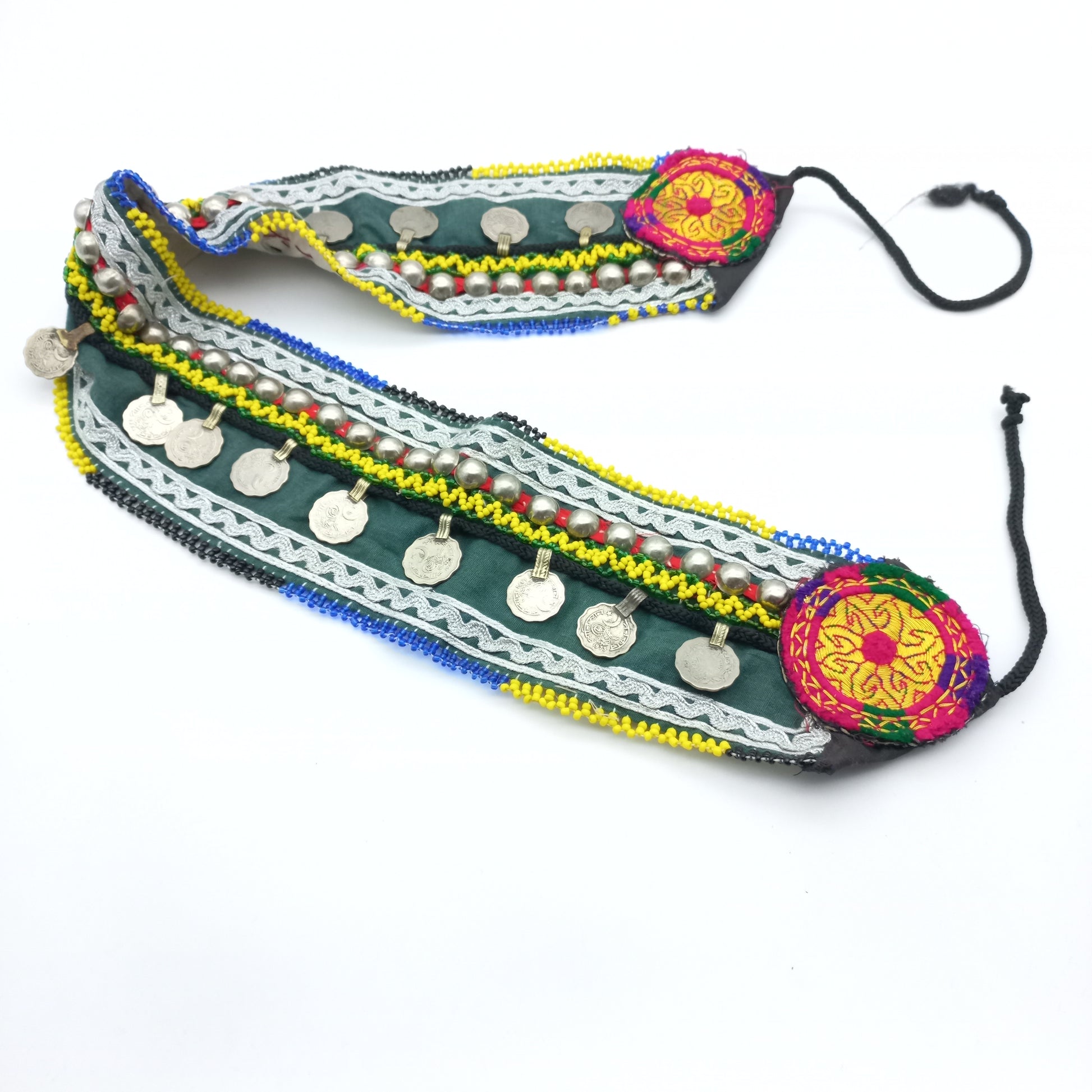 Cinturón pakistaní con base de tela, tejidos e incrustaciones de monedas de alpaca y mostacillas. Para usar como accesorio o decoración. Buena idea es enmarcarlo.