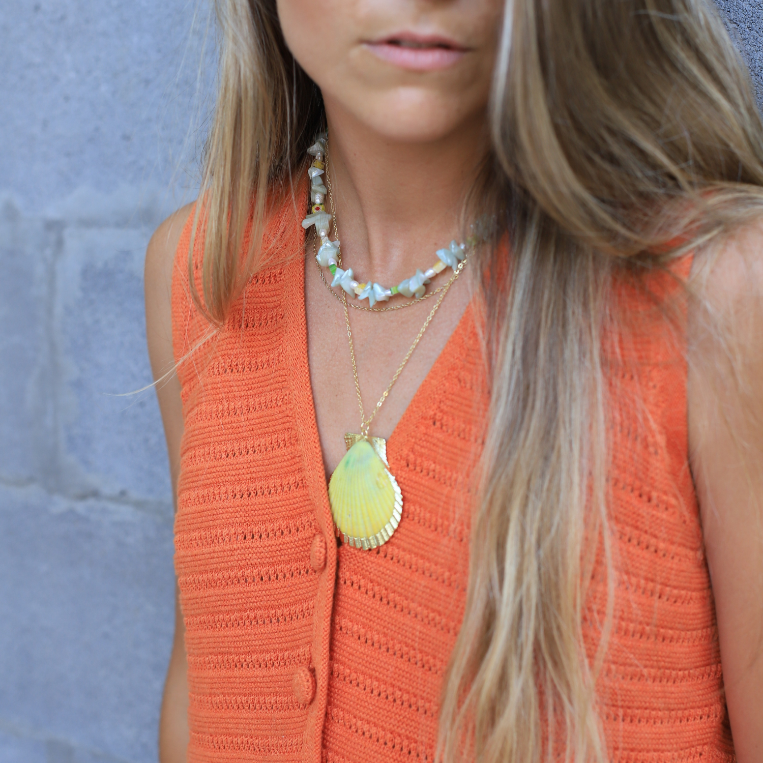 Collar con cadenita bañada en oro, colgante de conchita natural con borde enchapado en oro.