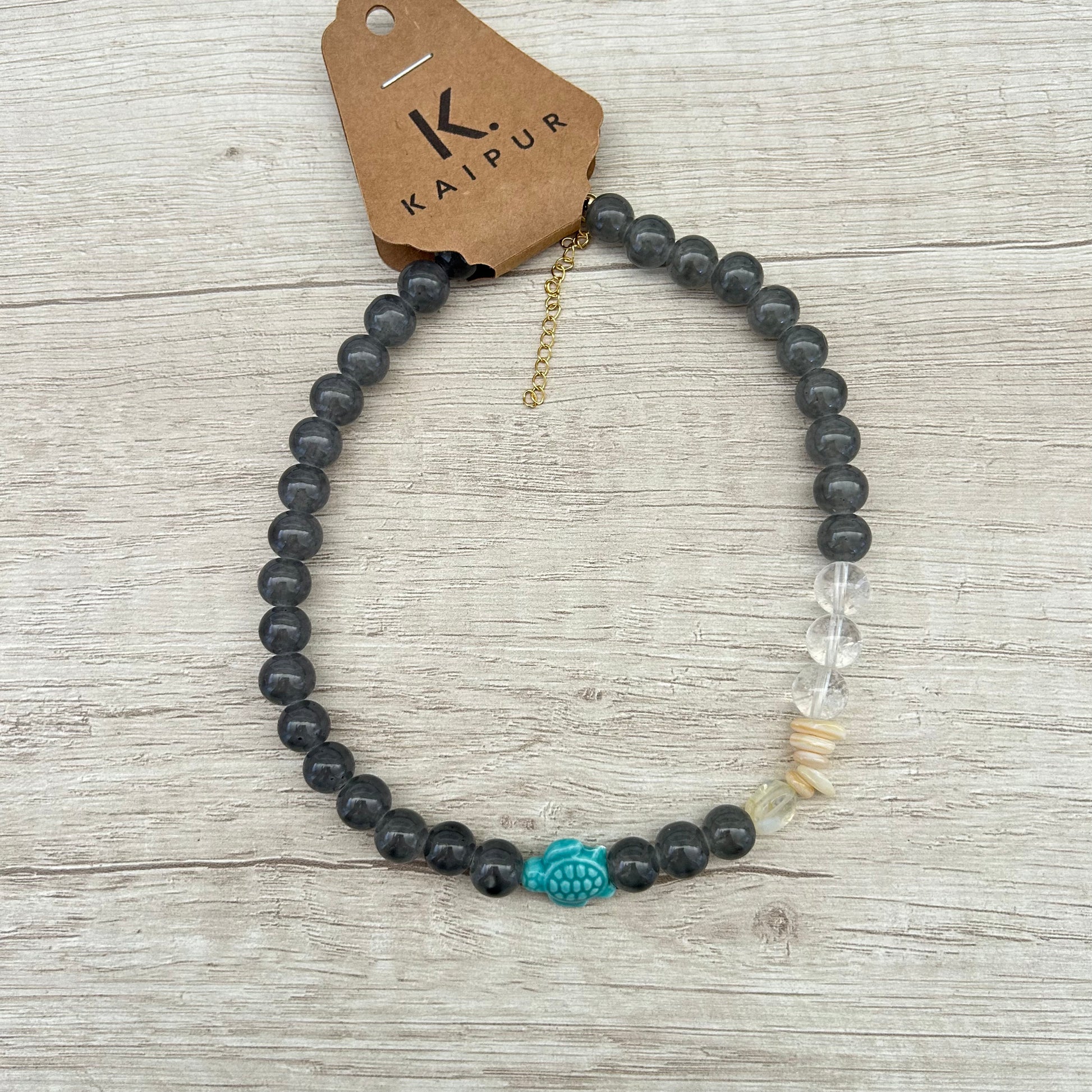 Collar de mostacillas de vidrio, mezcladas con piezas de cerámica y cuarzos