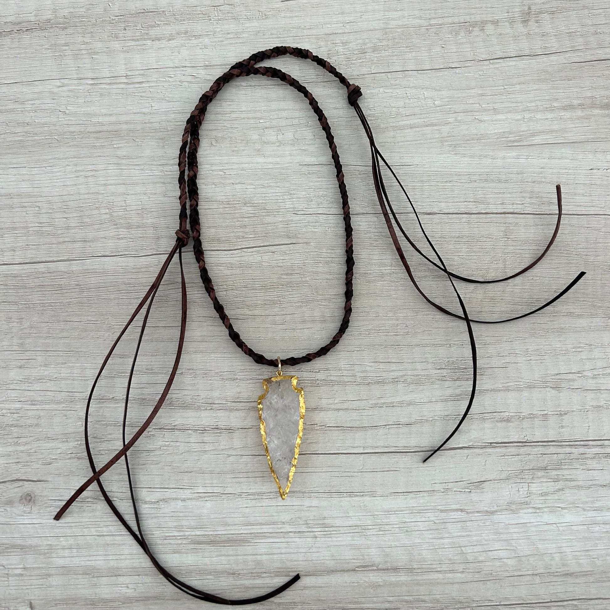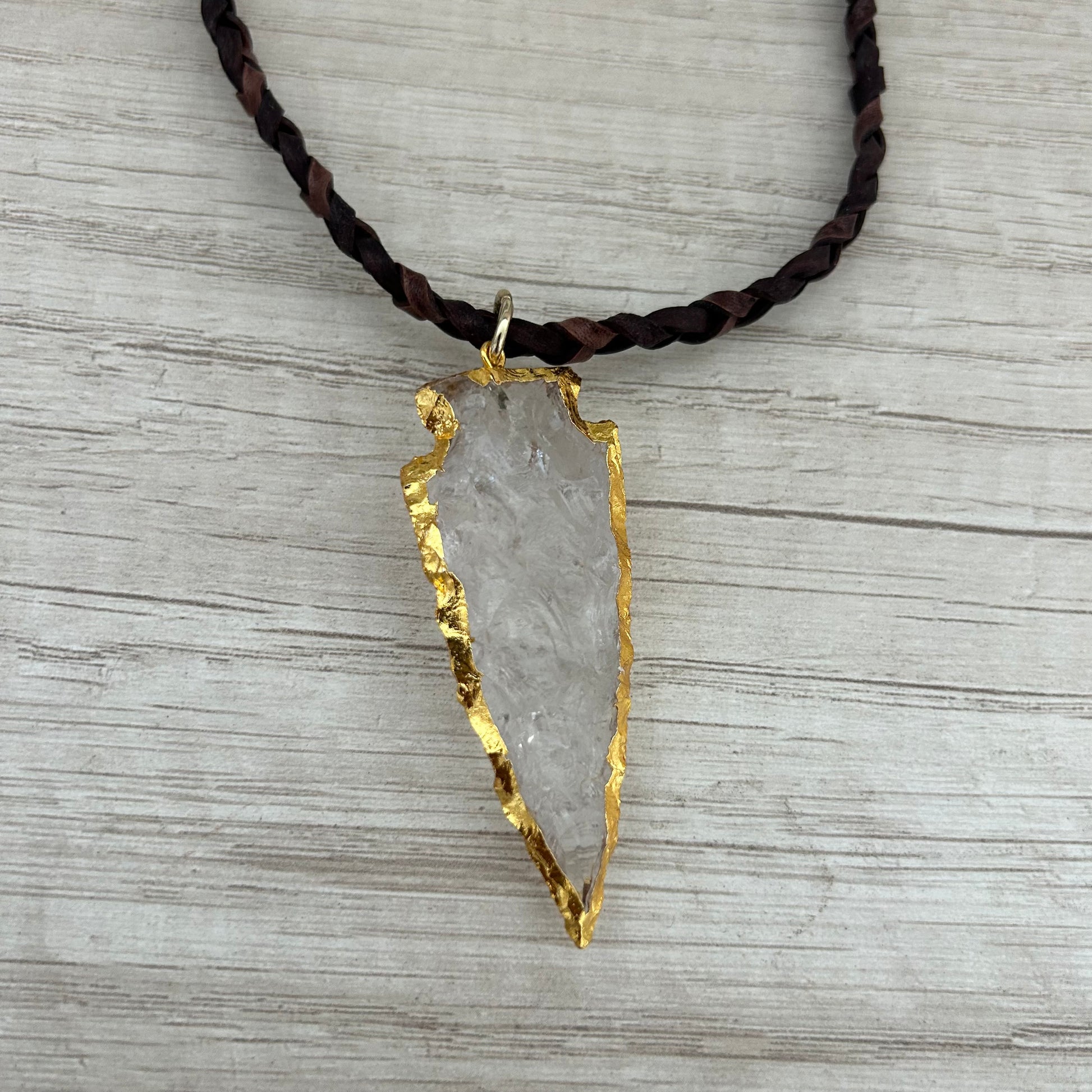 Lanza de piedra cuarzo con bordes bañados en oro con cuero trenzado café