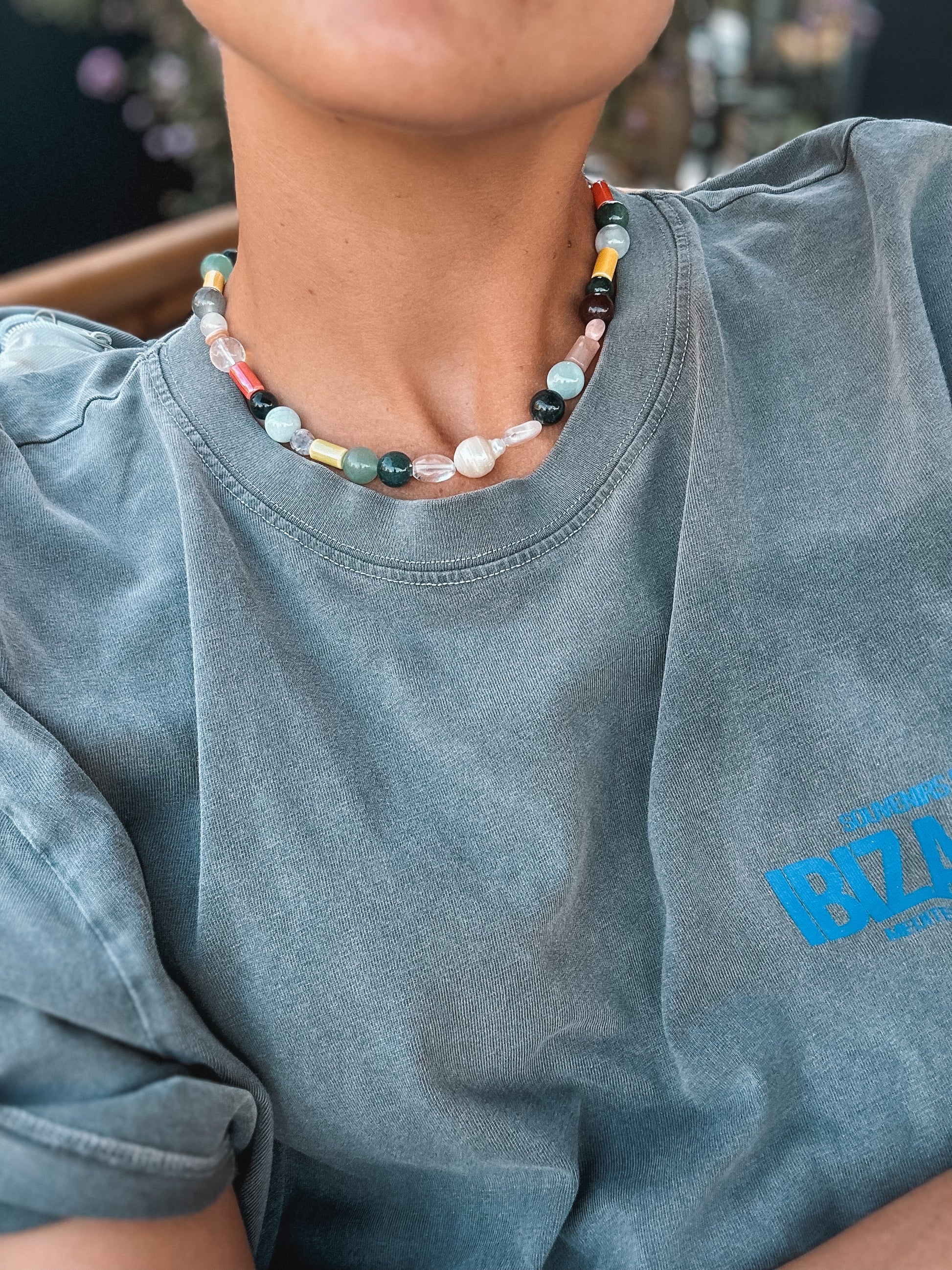 Collar de piedras (venturina, agata, cuarzo) y perlon de río irregular en el centro